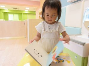 サンライズキッズ保育園では、毎日たくさんの絵本に触れています