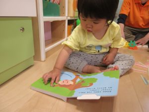 入園当初は座って絵本を見るということに慣れていなくてあまり興味を示しませんでしたが