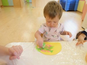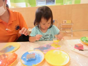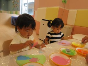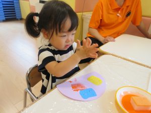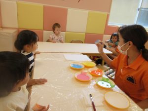 色々な絵の具を使ってポンポンするよ?と言う保育者の話をよく聞いています