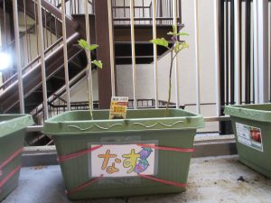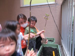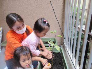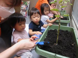 ナスの根っこや土を触ることを嫌がっていたお友達もスコップを使って