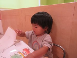 今回はご飯前にお椅子に座って好きな絵本を読んでいます(^ー^)
