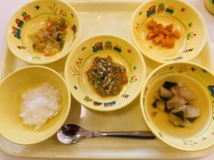 粥 すまし汁 鶏そぼろ煮 白菜の煮浸し ゆでかぼちゃ