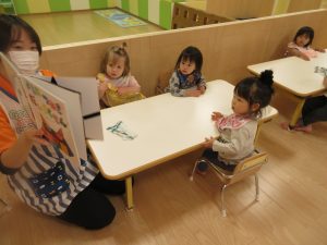 お給食の前にも絵本の読み聞かせをしています![]()