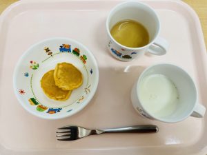 ※おやつのキャロットホットケーキは、にんじんのすりおろしを生地に混ぜて焼き、きれいな色のホットケーキに仕上がりました。にんじんが苦手なお子さまも食べやすいです♪