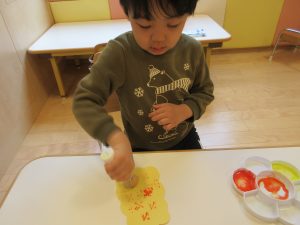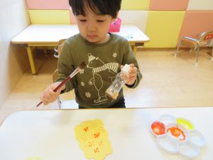 オレンジ色と黄色の絵の具に十字型のスタンプを押しましたよ(^^)