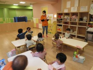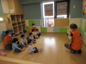 保育者からの出し物では、大型絵本の「はらぺこあおむし」。