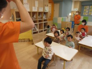 保育者の「だ~る~ま~さ~ん~の~」の掛け声に合わせて身体を揺らしたり