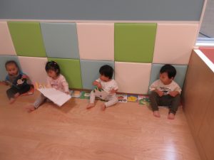 りんご組のお姉さんが座りだすと真似をしてみんなも壁ぺったん!