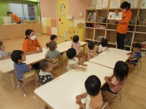 2022.07.13|お知らせ・イベント ?絵本読み聞かせプログラム? みなさん こんにちは(^^)/ 認可保育園 サンライズキッズ保育園 市川園です? ぶたさんが出てくるお話。 「ブーブー」と言ったり、鼻に指をあてたりしていましたよ 前へ 次へ