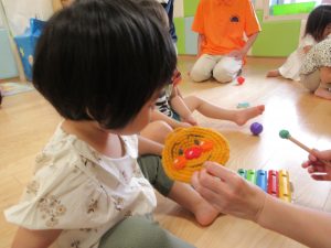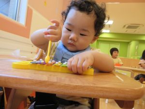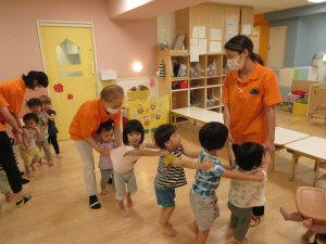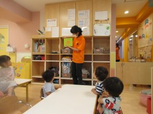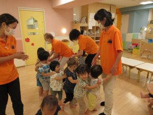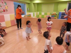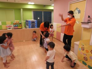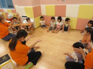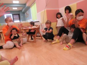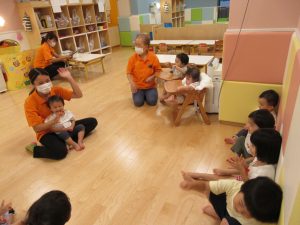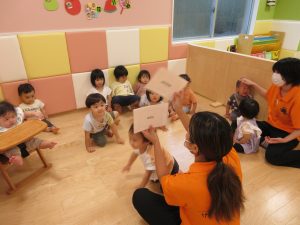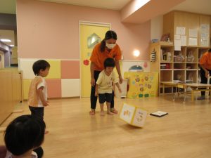 保育者手作りのサイコロを使って、ゲーム感覚で英語に触れていけるようにもしています(^^)/