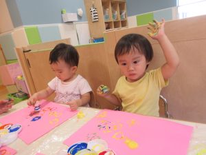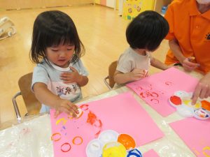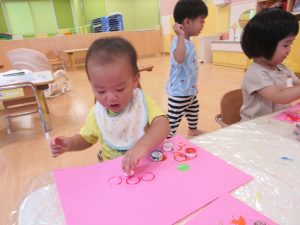 1歳児は、ペットボトルのキャップを使ってスタンプ![]()
