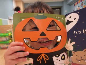 カボチャのお面をつけて、「ばあ~!」