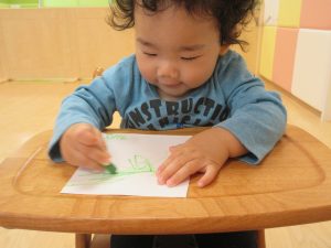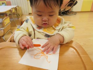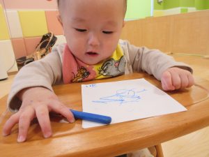 0歳児は、クレヨンを使ってお絵描き![]()