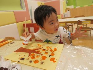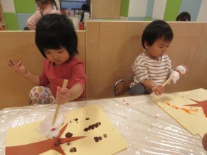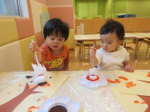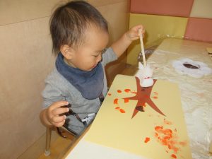 1歳児は、絵の具でタンポをやりました![]()