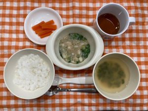 粥 味噌汁(小松菜) 白身魚のくず煮 人参の甘煮