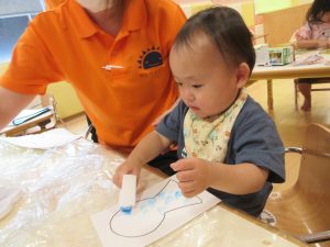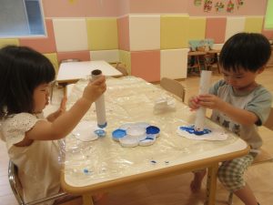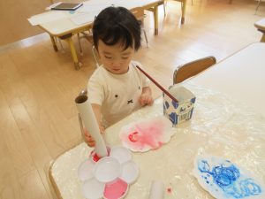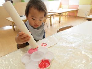 りんご組は画用紙に水を塗ってから、サランラップの芯に絵の具をつけ、模様をつけていきました😊