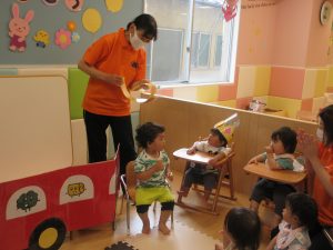 保育者からの出し物は【はらぺこあおむし】のペープサート🐛