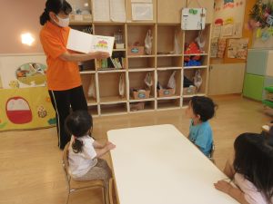 絵本に大好きなカエルが出てきたのを保育者に教えてくれる子も・・( *´艸`)💕