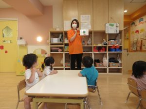 フラッシュカードの後は、袋に入ってるブロックを引いて、その色を英語で言ってから、同じ色のフラッシュカードの所に置いて行きましたよ(^^)/✨