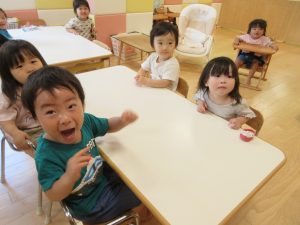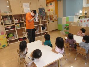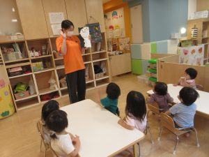 保育者と一緒に絵本を見ながら「ばあ!!」と元気よく言っています😊