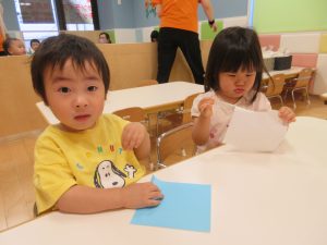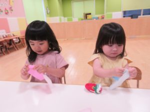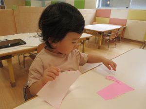 指先を使って折り紙をビリビリ破いて、おばけを作りましたよ👻