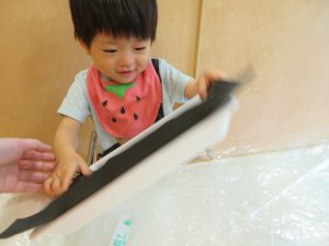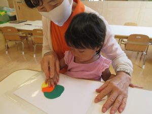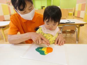 保育者と一緒に指で絵の具をのばして、あさがおの葉っぱを作りました🖌