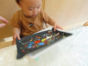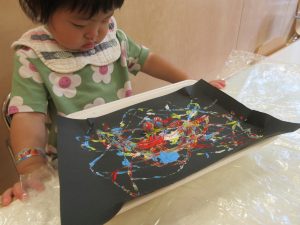 絵の具の上にビー玉を乗せてコロコロと模様を付けていきました👍