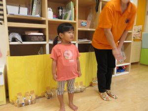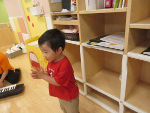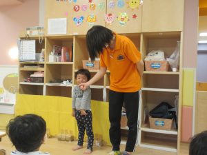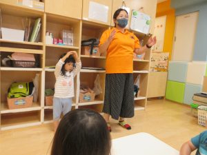 朝の会、帰りの会の歌の際に保育者と一緒に前に立ってもらっています😊