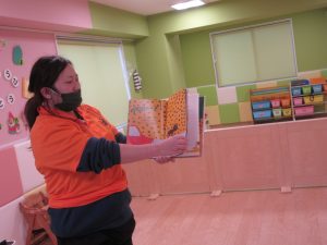 保育者が近くの図書館で絵本を借りてきて、読み聞かせをしてくれました!(^^)!