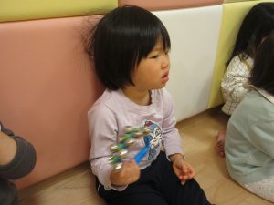 2月は『ゆき』『こぎつね』の歌に合わせて、「ポン ポン あたま」「ポン ポン おなか」とリズムに合わせながら叩く場所を変えたりして、リズム遊びを楽しんでいます🎵