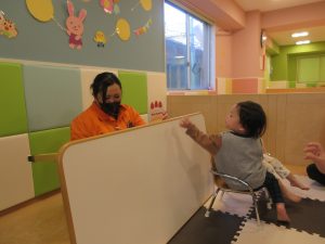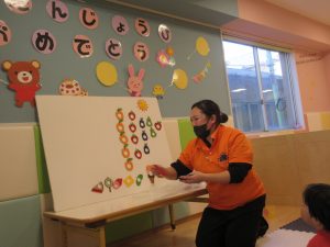 子どもたちははらぺこあおむしが大好きなので、保育者と一緒に歌を歌ったり、真剣に見ている子どもたちでしたよ🎵