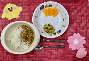今日は、お誕生日会メニューでカレーを食べながら「おめでとう」の声も聞こえてきて、みんなたのしそうでした。