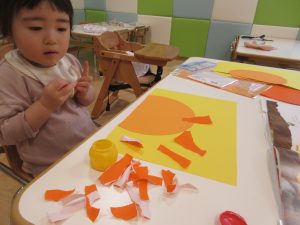 ☝🏻の指が難しく、全部の指に絵の具をつけて模様を付けたり、慎重に一つずつ模様を付けたりと様々な姿が見られました!(^^)!