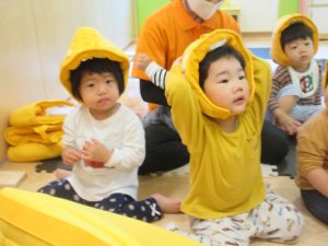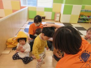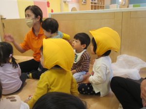 保育者の話を聞きながら防災頭巾もしっかりと被ることが出来ましたよ✨