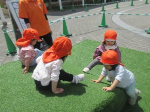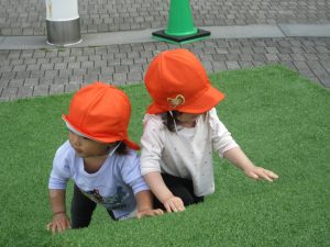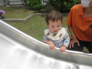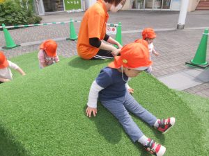 山になっている芝生を自分の足で登ろうとしたり、滑り台の様に楽しんでいましたよ♬