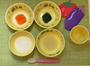(写真は離乳食後期です。年齢によって形、固さ、盛り付け量を変えて、提供しています。)