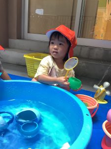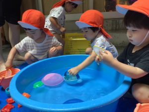 いちご組、もも組はまだ慣れていないからか静かに座りながらバケツに水を入れたり、保育者と一緒に水鉄砲をやったりと遊んでいます🔫