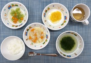 (写真は離乳食後期です。年齢によって形、固さ、盛り付け量を変えて、提供しています。)