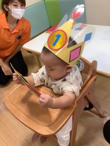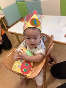 前に出て、王冠をかぶせてもらい、誕生日カードを受け取ると「へへっ」と大喜びのお友達😊