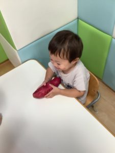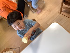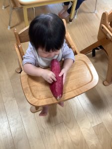 給食でさつまいもが出た時には、中々食べられない子や、実際に触ったから頑張って食べた子などさまざまな姿が見られました。