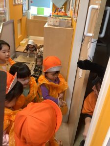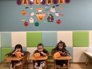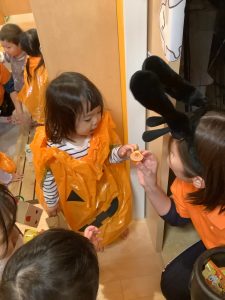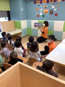 もも組のお部屋でハロウィンの絵本を読みながら魔法の言葉『トリックオアトリート』と言うとお菓子をもらえることを伝えていきました。