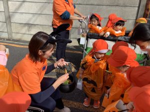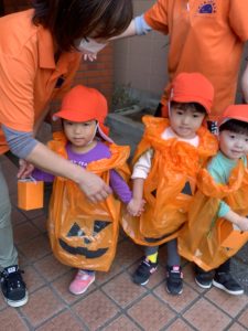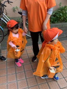 いちご組、りんご組は自分達で目鼻口を貼ったカボチャの衣装を着てお散歩へ!