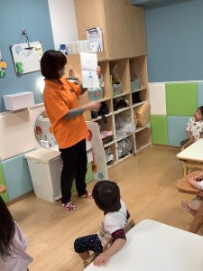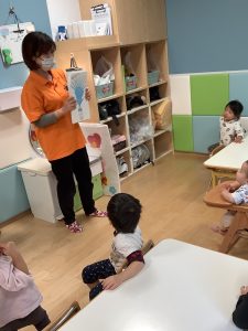 保育者が「いろいろ・・」と絵本を読むと元気いっぱいに「ばあ!」と言う子どもたち😊