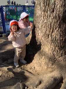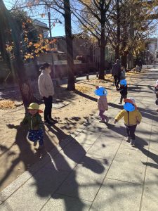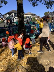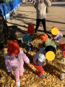 保育者と保育者の間を走ったり、落ち葉に触れたりと遊んでいます!