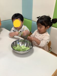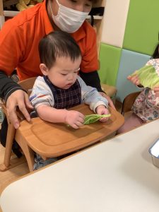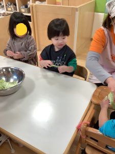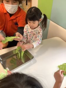 キャベツの葉を触り、「つめたいね」「かたいね」「においがするよ」など