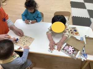 こちらでは、パズルをしていますよ!形にはめるパズルや絵を見ながらはめていくパズルまで様々な種類があります。好きなパズルを選んで完成を目指していますよ![]()