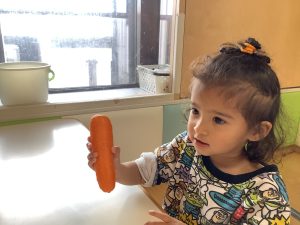 調理する前の野菜はあまり触れたことがないため、不思議そうな顔をしていましたが、触れたことが嬉しかったのか