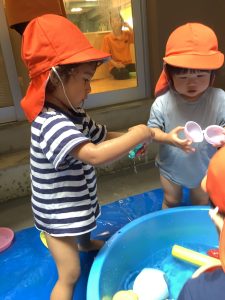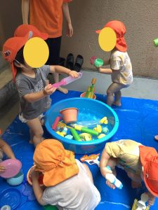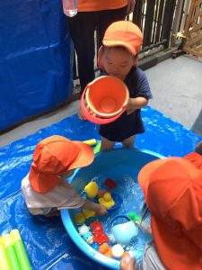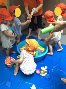 水遊びはお家でやっている子もいれば、保育園でデビューする子もいるかと思います![]()