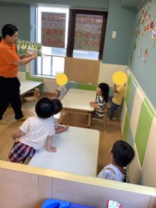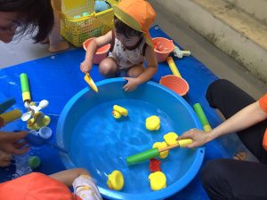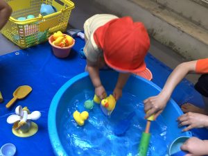 水鉄砲を使って小さいペットボトルに水を入れ替える事にはまる姿がよくみられ夢中になって遊んでいます!