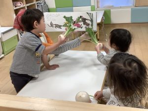 絵本の中に出てくるカブと実際のカブを見比べていますね!